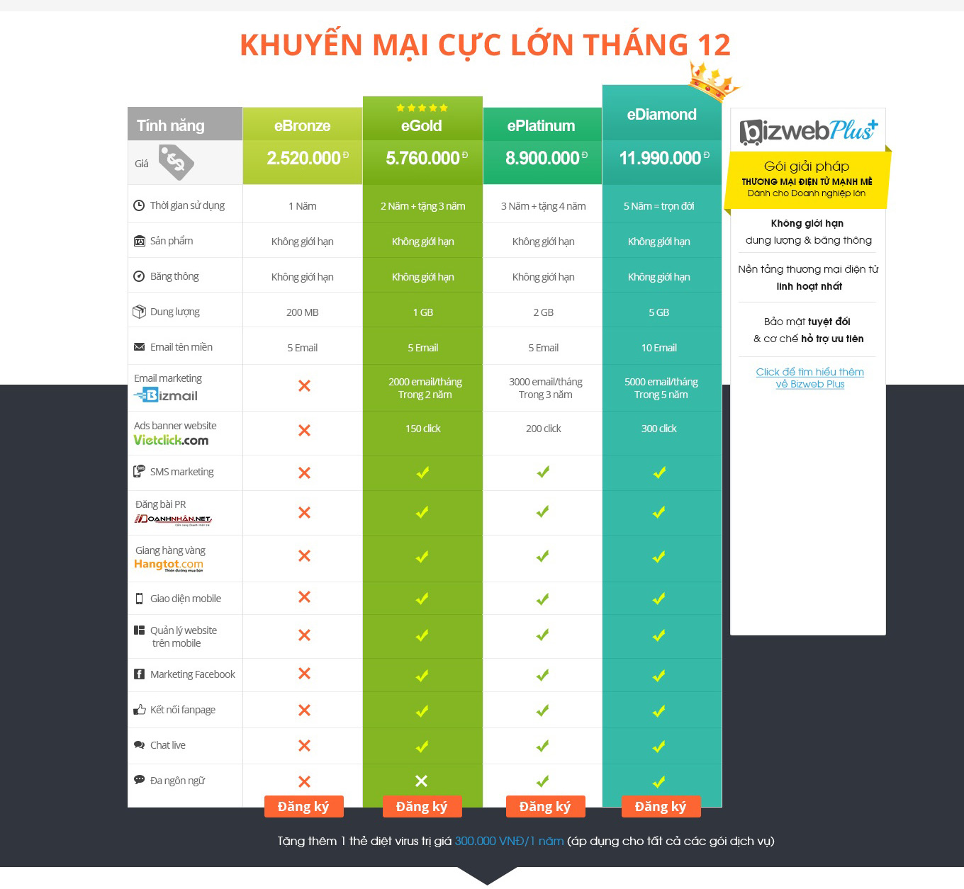 GIÀNH CHO KHÁCH HÀNG MỚI : Khi đăng ký thiết kế website , ngoài những dịch vụ đi kèm hỗ trợ thêm về SMS marketting , kết nối facebook ....khách hàng sẽ được tặng thêm thời gian sử dụng 3 năm sử dụng , Egold/2 năm và tặng 4 năm sử dụng thêm với Eplatinum/3 năm , gói Eplatinum , sử dụng trọn đời với gói Ediamond / 5 năm .