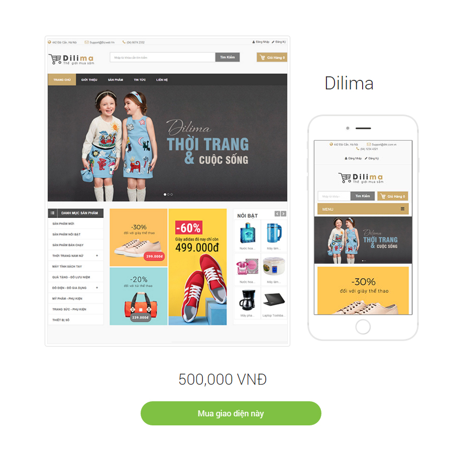 Banner khổ rộng ở trang chủ giao diện Dilima sẽ ngay lập tức gây ấn tượng cho khách hàng ngay cái nhìn đầu tiên. Màu sắc chủ đạo là màu cà phê sữa, ngọt ngào, nhẹ nhàng, mang đến cảm hứng mua sắm. Bố cục hợp lý, đẹp mắt, dễ dàng nắm bắt và thuận tiện cho việc mua hàng. Trang liên hệ với bản đồ kích thước lớn, rõ ràng giúp khách hàng có thể nhanh chóng tìm kiếm địa điểm shop của bạn. Giao diện không chỉ hiển thị tốt trên máy tính mà trên cả điện thoại và máy tính bảng. Dili ma là một lựa chọn tuyệt vời cho các website thời trang và mọi lĩnh vực kinh doanh khác.