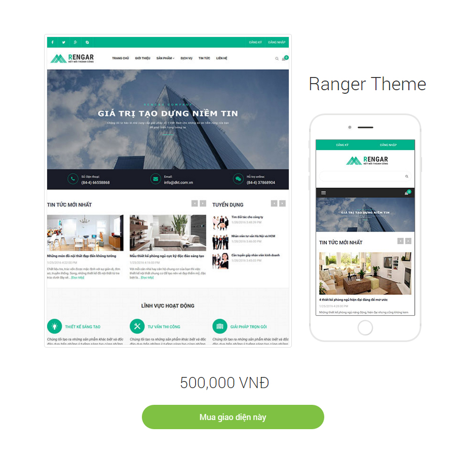 Với thiết kế hợp lý, tinh tế, giao diện Ranger là một lựa chọn tuyệt vời nếu bạn đang thiết kế website bán vật liệu xây dựng hoặc đồ nội thất. Màu sắc bắt mắt và banner kích thước lớn sẽ nhanh chóng tạo ấn tượng cho khách hàng tham quan website. Nút lên đầu trang được thiết kế độc đáo dưới chân trang rất thuận tiện cho người dùng khi duyệt web. Trang liên hệ tích hợp bản đồ lớn giúp khách hàng nhanh chóng tìm thấy địa điểm shop của bạn. Bên cạnh đó, giao diện còn hiển thị đẹp trên mọi thiết bị di động.