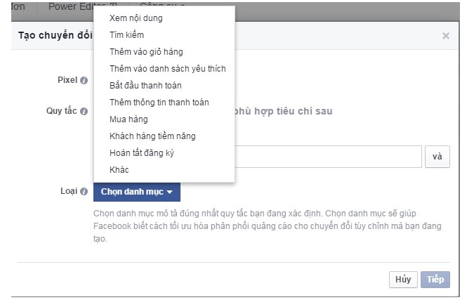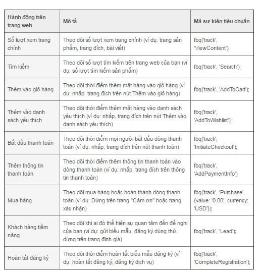 Có 9 loại chuyển đổi tiêu chuẩn bạn có thể sử dụng với Sự Kiện Tiêu Chuẩn, mỗi chuyển đổi sẽ có một dòng mã riêng. Mã này sẽ cho phép Facebook theo dõi – nhưng chỉ trên trang mà bạn muốn theo dõi thôi nhé.