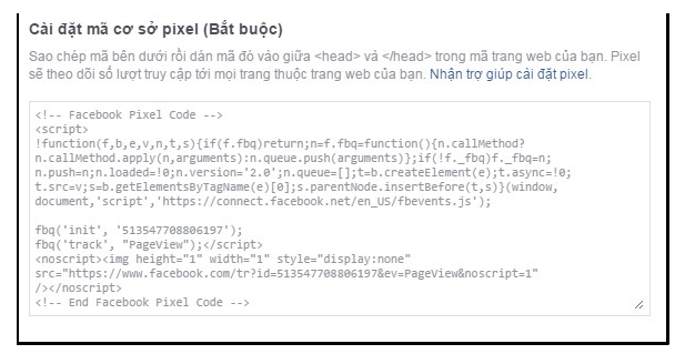 Sau khi sao chép đoạn pixel, bạn có thể tự chèn hoặc nhờ nhân viên kĩ thuật web giúp bạn chèn đoạn mã này vào giữa thẻ <head> trong mã code tất cả các trang của website.