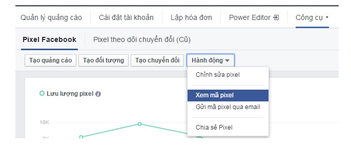 Bước 1: Bắt đầu với trình Quản Lý Quảng Cáo –> Công cụ –> Pixel. Ở mục Hành Động, hãy chọn Xem mã Pixel